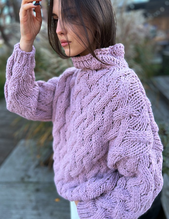 Sweter damski wrzosowy slow z pięknym warkoczowym splotem.