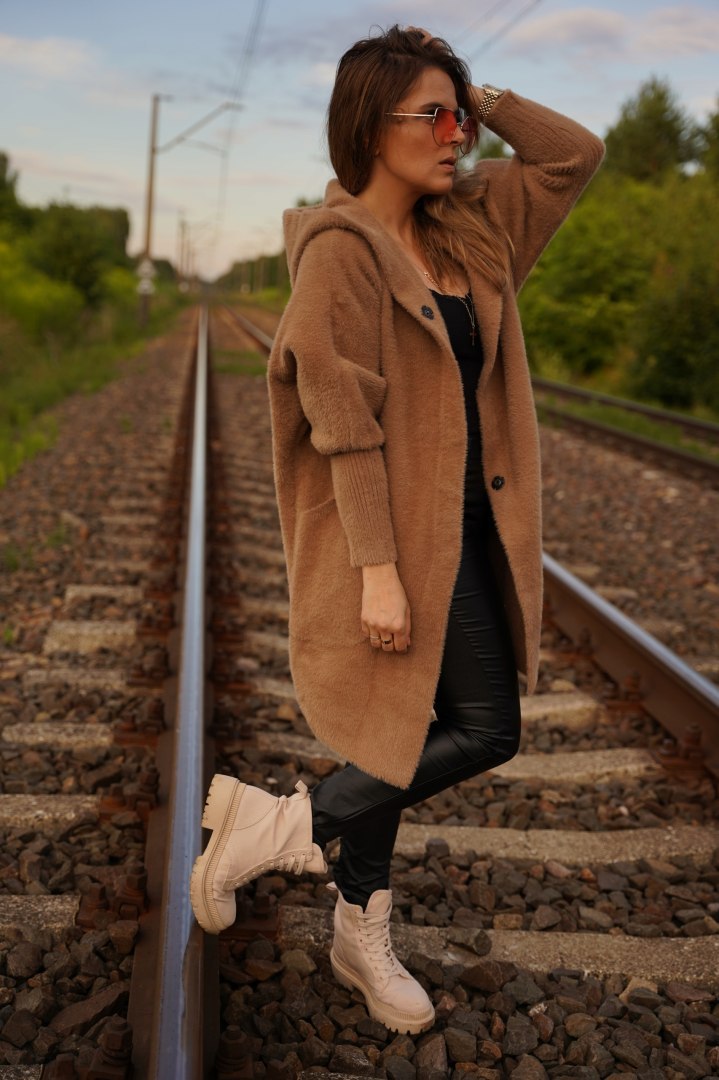 DŁUGI CIEPŁY SWETER Z ALPAKI Z KAPTUREM CAMEL ♥ Ubrania damskie prosto z Włoch.