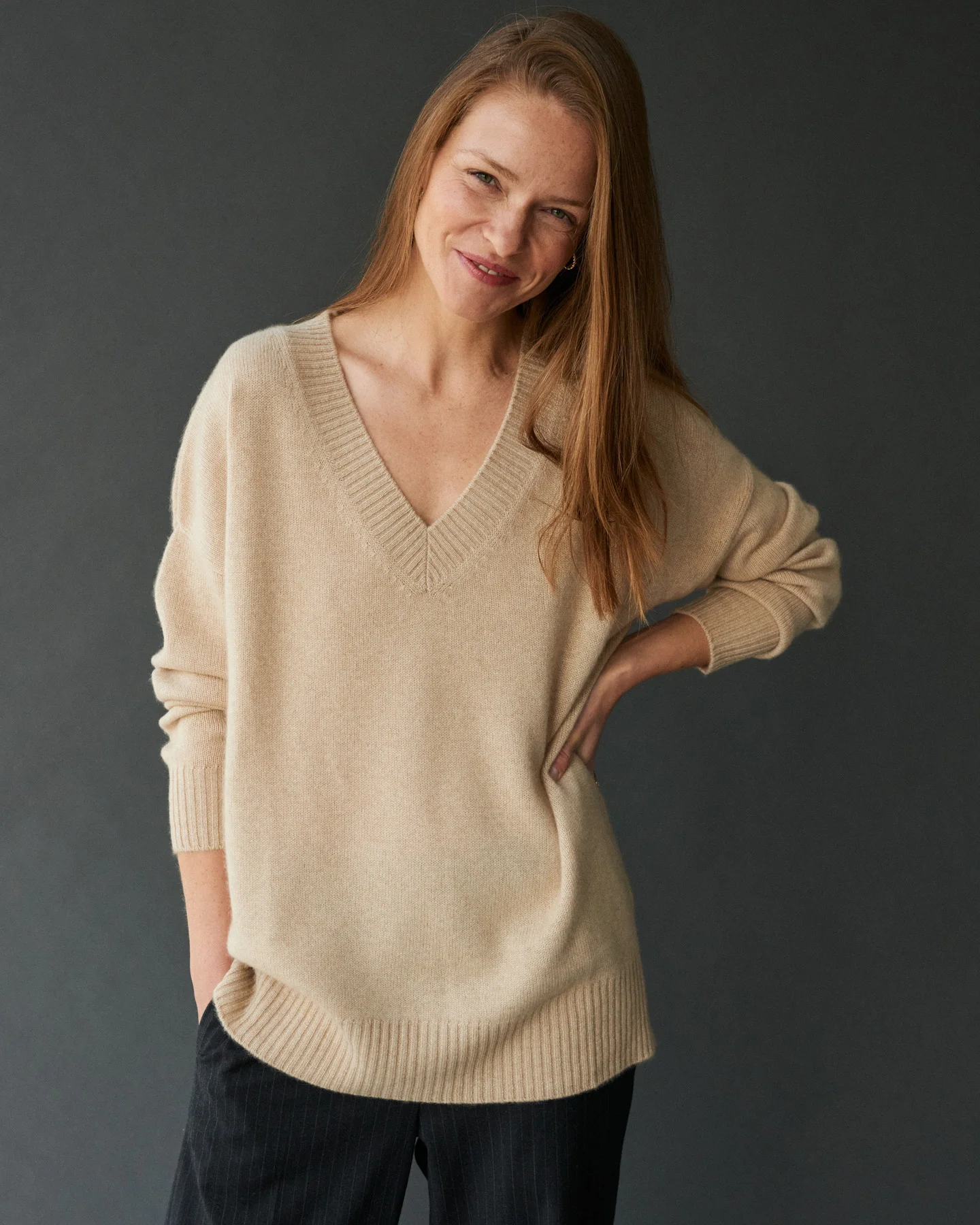 ELIA kaszmirowy sweter z dekoltem w serek beż